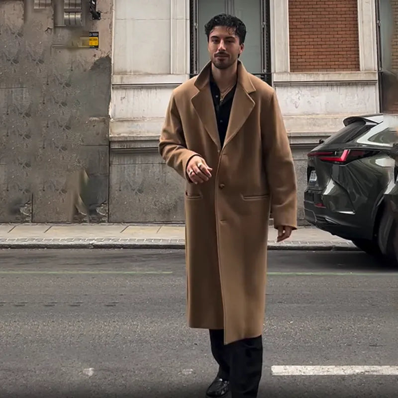 Este abrigo combina el diseño atemporal con la elegancia actual. Su corte por encima de la rodilla realza la figura masculina y aporta una silueta sofisticada, perfecta tanto para entornos urbanos como profesionales.